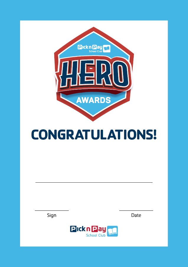 • Each month – from February to September – reward the learner, whom you have identified as the Hero of the Month, with a Hero Awards certificate, preferably at a gathering such as an assembly. You can also invite your local Pick n Pay Manager to hand over the award, with the local newspaper present.